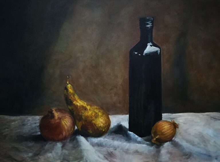 Martwa z cebulami i gruszką – olej na płótnie 50×70