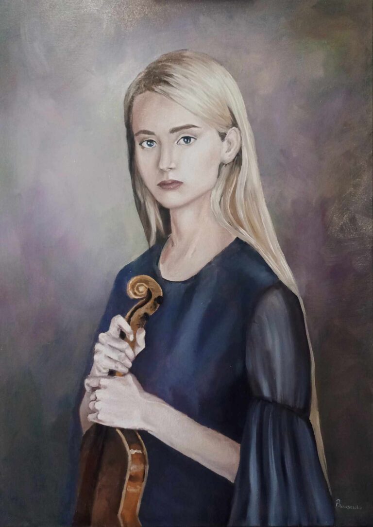 Portret skrzypaczki – olej na płótnie 50×70. Portret przedstawia Weronikę Dziadek